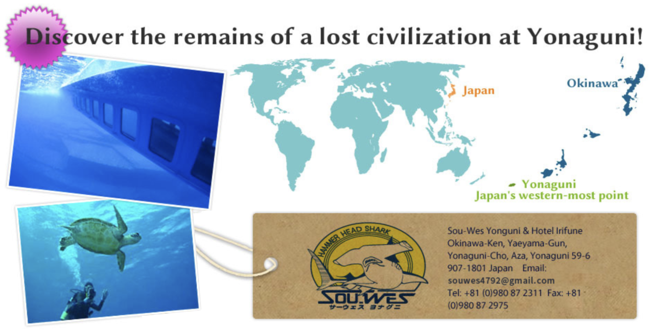 | Sou-Wes Yonguni & Hotel Irifune Okinawa-Ken, Yaeyama-Gun, Yonaguni-Cho, Aza, Yonaguni 59-6 907-1801 Japan Email: sawes@yonaguni.jp Tel: +81 (0)980 87 2311 Fax: +81 (0)980 87 2975 |